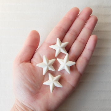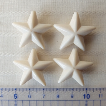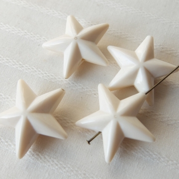 約26mmと存在感のあるサイズですが樹脂製で軽いのでピアス・イヤリングにも!よく見るとマーブル状の模様が見えるものも(樹脂の着色の際の混ぜ具合によるものかと)真っ白でなく柔らかいアイボリー色が素敵です♪大きなサイズもございます。 ※星形ビーズ(L)税別250円/1個